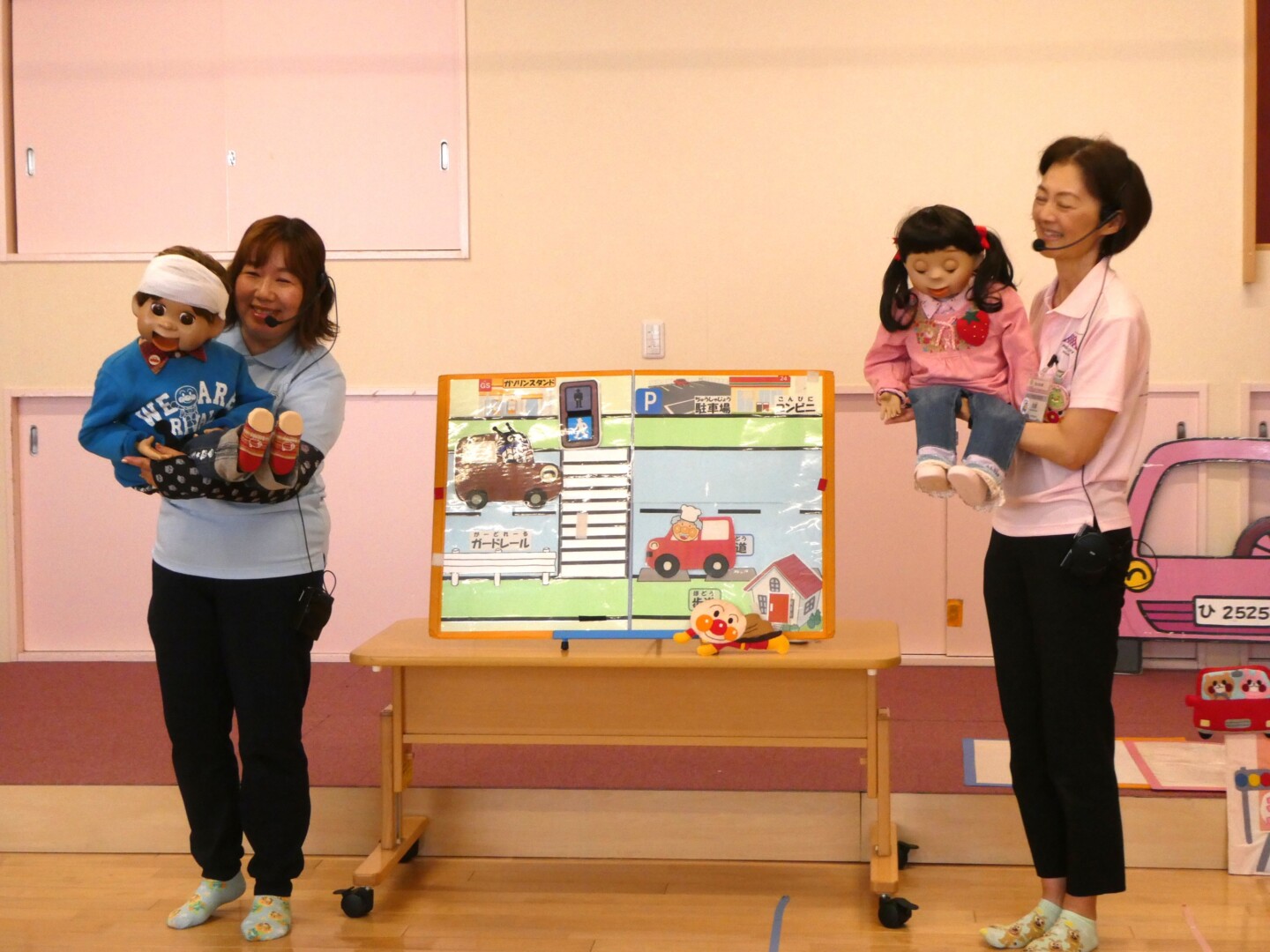 鹿児島市安心安全課の2名の先生に来園いただき、交通安全についてのお話と、横断歩道の渡り方を教えていただきました。