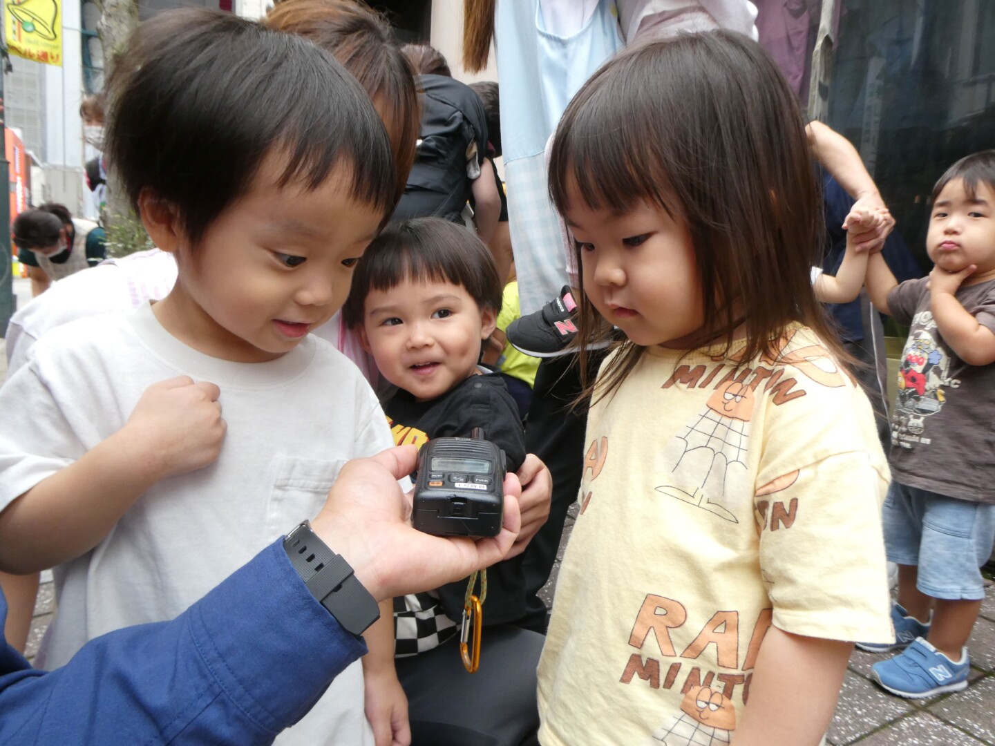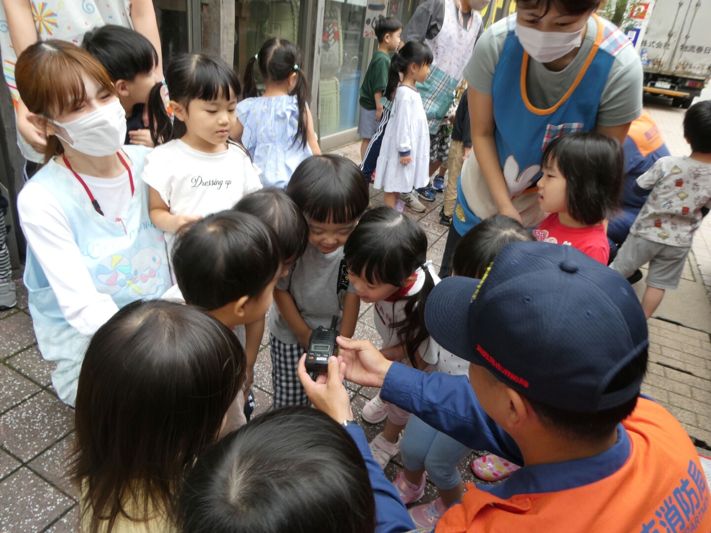 その後の消防車見学では、ホースを触らせてもらったり、無線機をみせてもらったり、大興奮の子ども達!