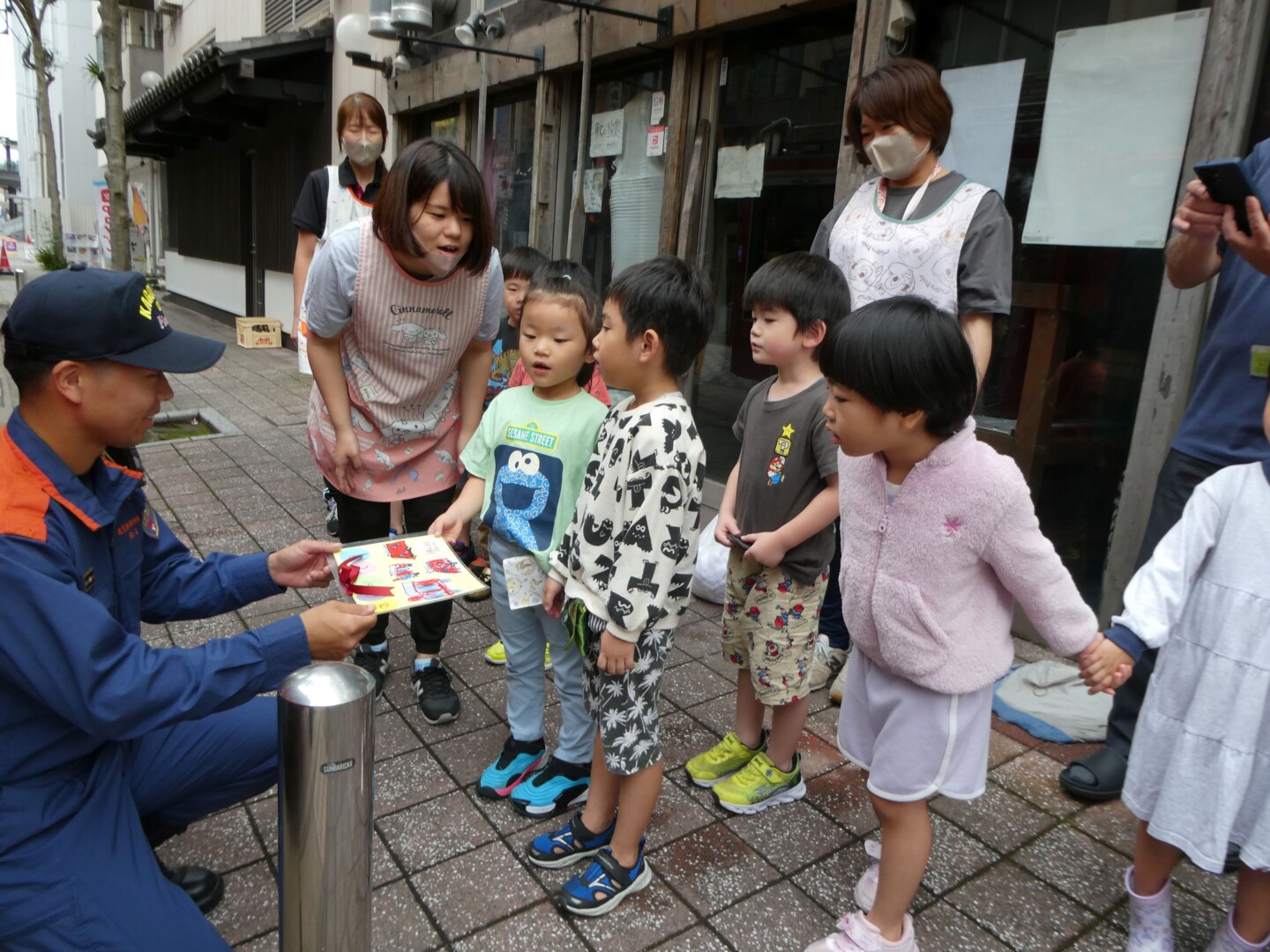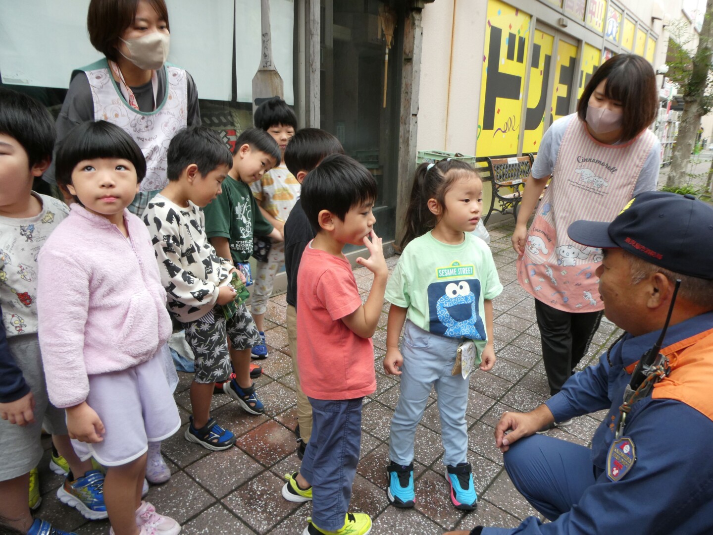 調理室から「火事だー!」と笛の音が聞こえると、保育士のところへ集まる子ども達!