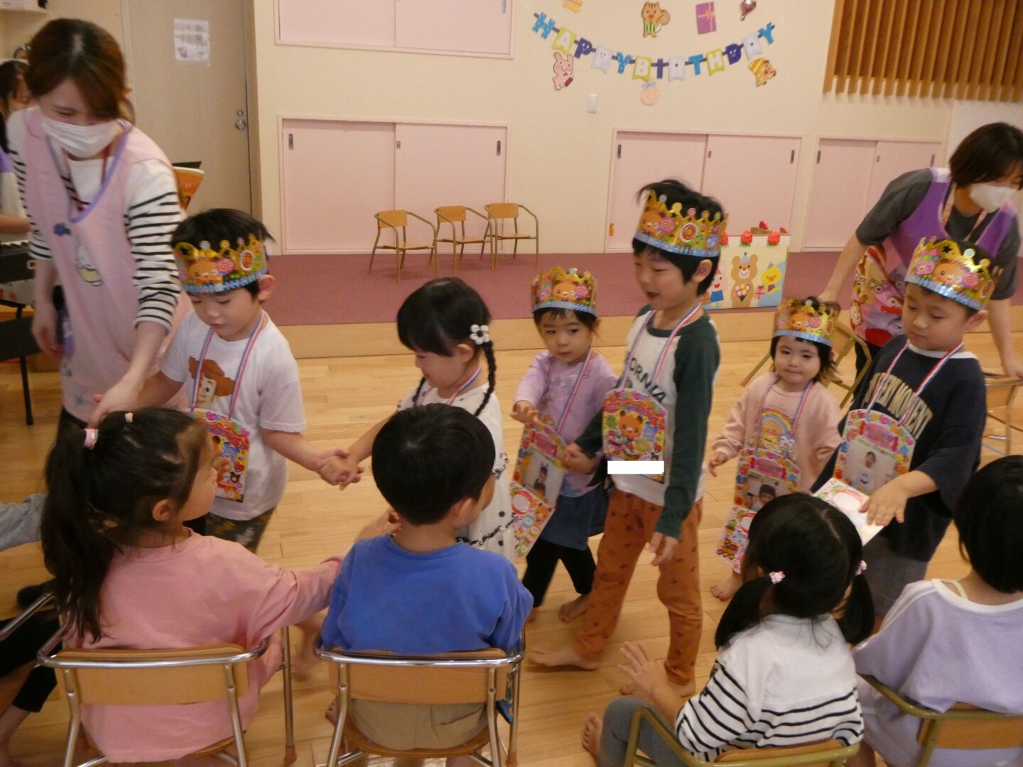 誕生児のお友だちは冠をかぶって手をつなぎ、みんなとハイタッチ!